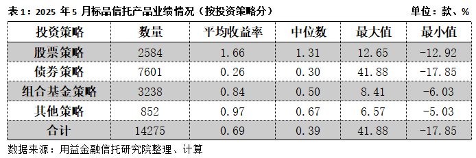 5月存续标品信托产品整体的平均收益率为0.69%,中位数收益率为0.39%,环比明显大涨。在中美关税谈判缓和叠加存款利率与LPR双降超预期落地等一系列利好因素作用之下,5月权益市场明显回暖、债市稳中有升,各投资策略的月度收益率有不同程度的增长,尤其是股票策略信托产品。