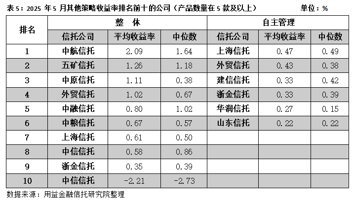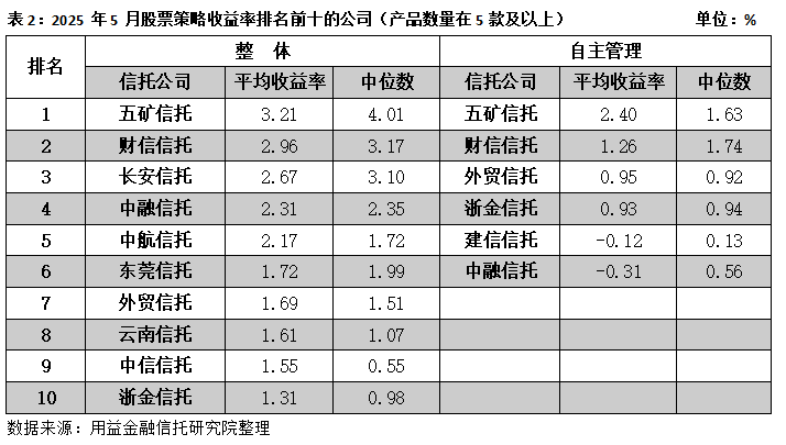 5月信托公司自主管理的股票策略产品披露净值的仅有169款,其中,五矿信托旗下产品的平均收益率高于行业平均水平,业绩表现相对突出;而财信信托、五矿信托旗下产品的中位数收益率明显高于行业平均水平,投资管理能力较强,大多数产品能够取得较好的收益。
