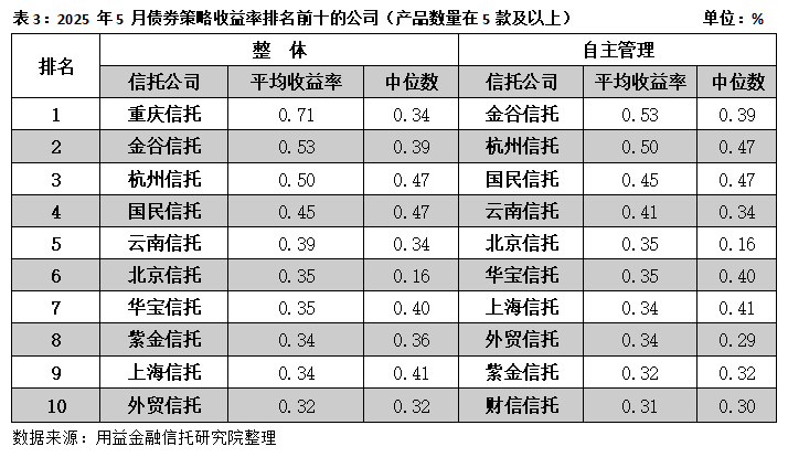 5月信托公司自主管理的债券策略产品中,披露净值的有5004款。前十机构产品投资回报稳定,月平均收益率均在行业平均水平之上,业绩表现较为稳健。