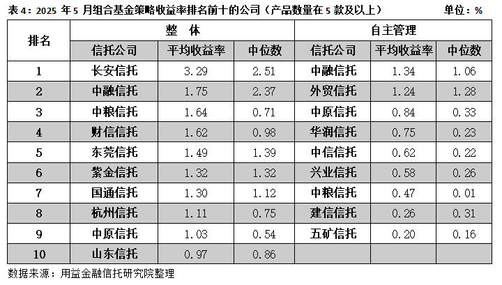 从平均收益率看,排名前十机构的组合基金策略产品收益率均高于行业平均水平,其中,长安信托、中融信托、中粮信托等9家机构的5月产品平均收益率在1%以上,业绩表现突出。从中位数收益率看,10家机构的组合基金策略产品的中位数收益率均高于行业平均水平,而长安信托、中融信托等5家机构的中位数收益率均高于1%,投资者持有体验较好。